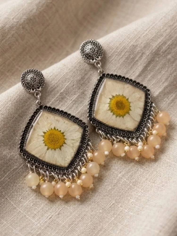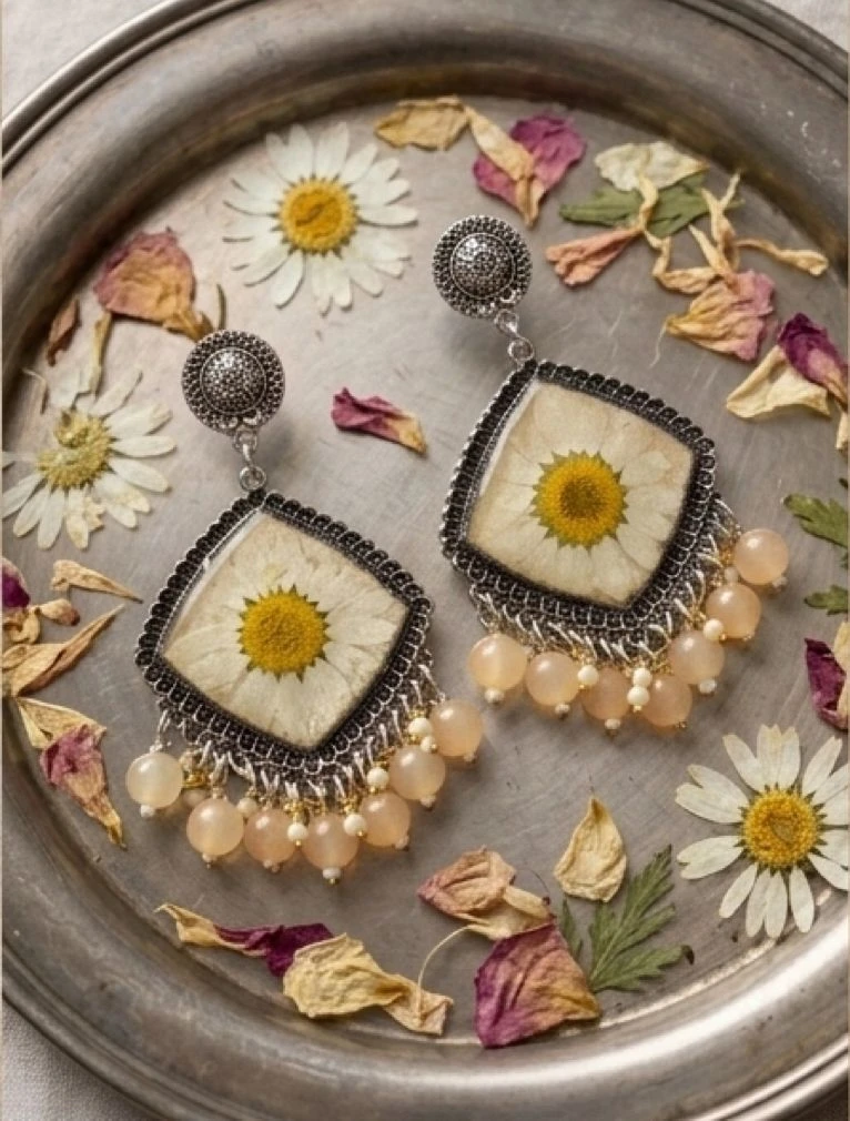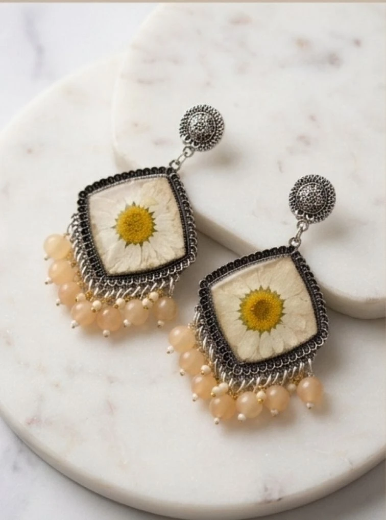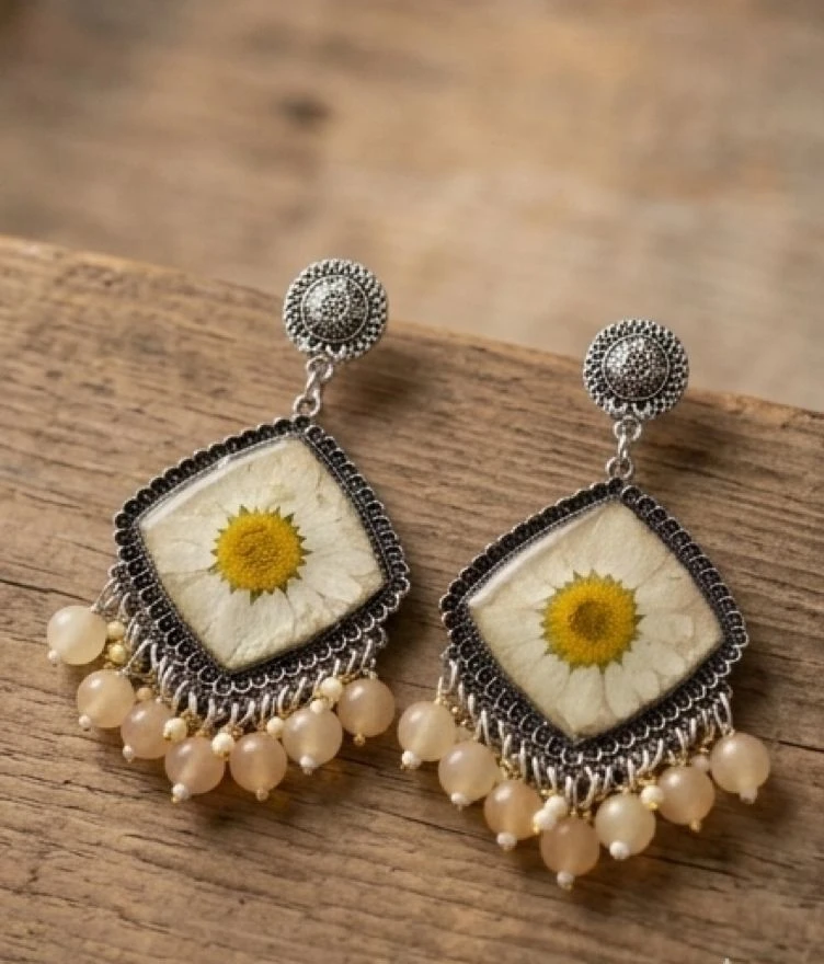 Add a touch of nature to your style with these beautifully handcrafted pressed flower earrings. Each pair features a real daisy delicately preserved in a clear resin frame, highlighting its natural beauty and uniqueness. The vintage-style silver frame combined with soft peach-toned beads creates an elegant boho aesthetic that’s perfect for both casual and festive outfits.