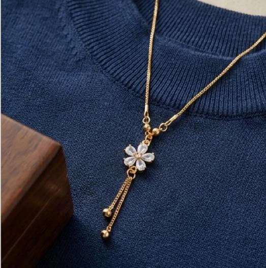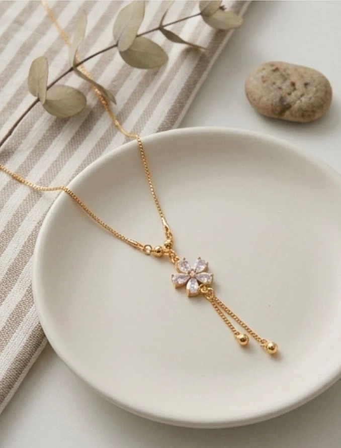 The centerpiece flower is complemented by a dainty drop detail with fine chain tassels and polished gold beads, creating soft movement and an elegant silhouette. Suspended from a sleek, adjustable chain, this necklace sits beautifully along the neckline—perfect for both everyday wear and special occasions.