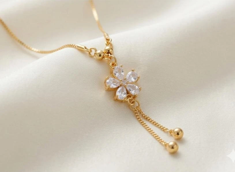Add a touch of delicate charm to your jewelry collection with this beautifully crafted floral pendant necklace. Designed in a radiant gold-tone finish, the pendant features a graceful flower motif adorned with sparkling, petal-shaped stones that catch the light from every angle.